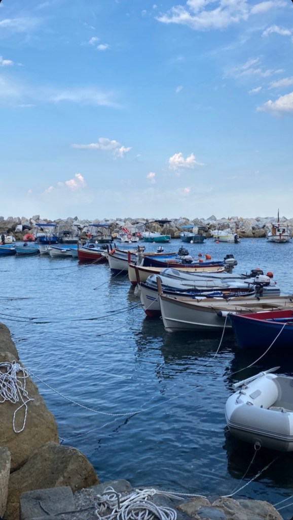 If you’re visiting Riomaggiore, there is a dock filled with boats that has a spectacular view, and if you walk up the stairs around and you should find a small beach!