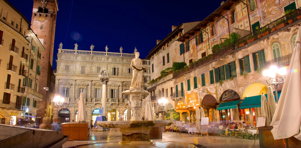 The architectural structure is mesmerizing. During the day, you’ll see small markets selling souvenirs, masks, other products, and even fruits. There are different monuments to see, and in the center you will see a fountain of Madonna Verona